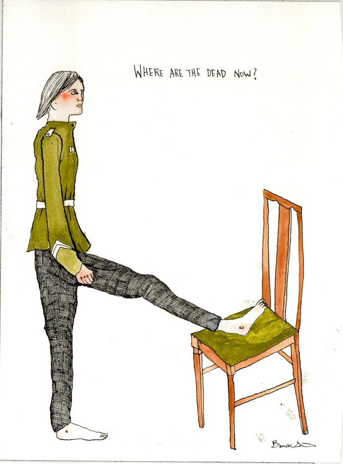Her surreal watercolor-and-ink scenes have caught the eye of many, including poet and translator Anne Carson, Stone’s former professor at NYU. Carson asked Stone to provide artwork for Antigonick, her recent translation of Sophocles’ Antigone, encouraging her “to make drawings of some other world entirely, some other story.”